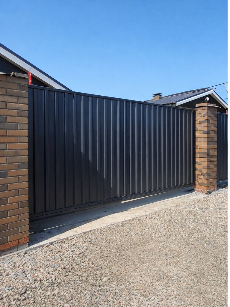 Откатные ворота изготавливаются под конкретный проём, двигаются вдоль линии ограждения и не занимают место перед въездом. Решение удобно для дома, склада и коммерческого объекта.